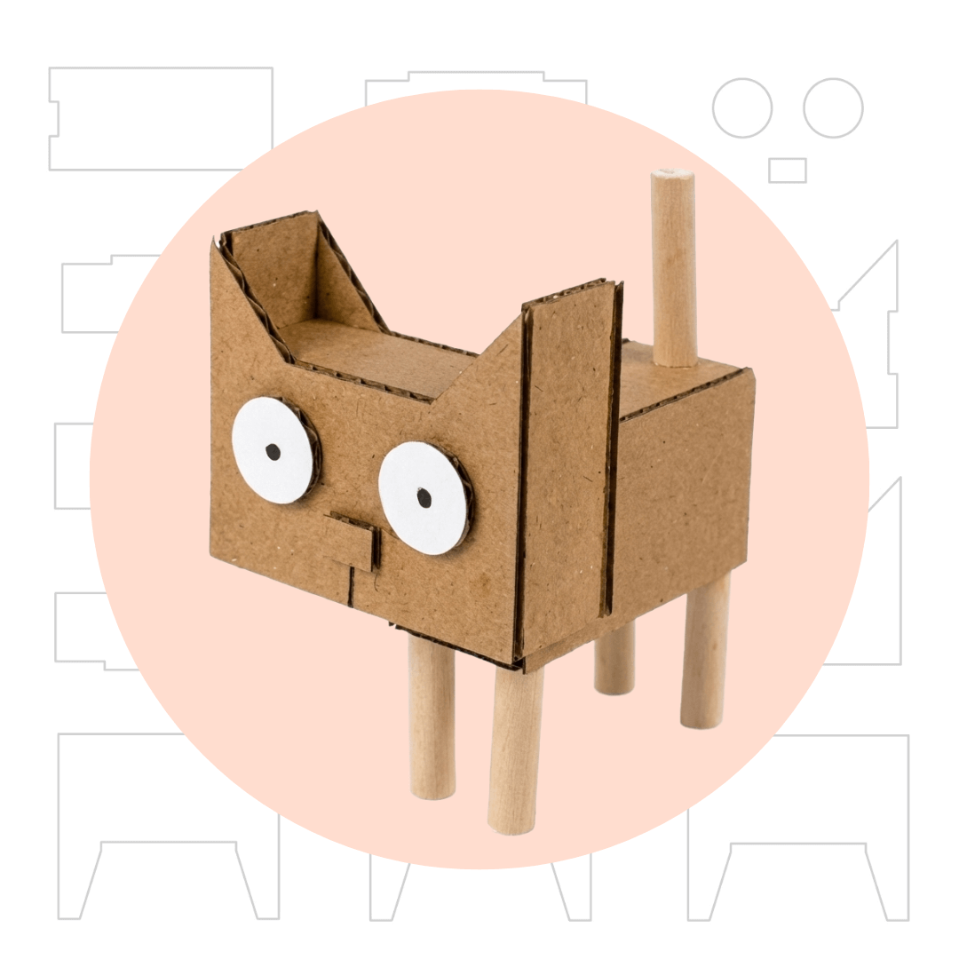 This box-shaped cat brings a fresh, modern twist to cardboard crafting. Clean lines and bold shapes give it a fun graphic look that stands out on any shelf.