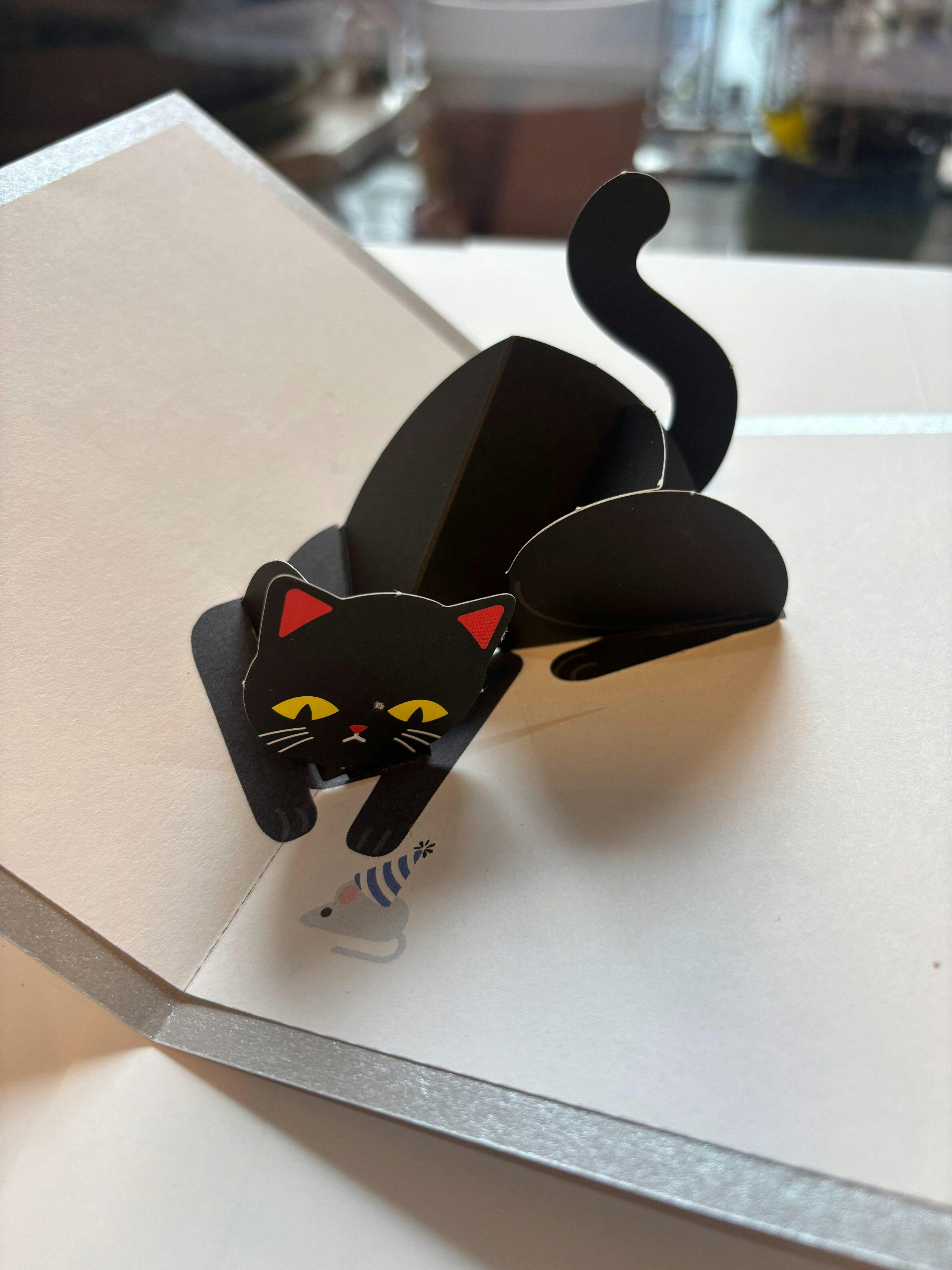 With every opening of the card, a cute black cat springs into view—ready to pounce on the tiny illustrated mouse and charm whoever receives it.